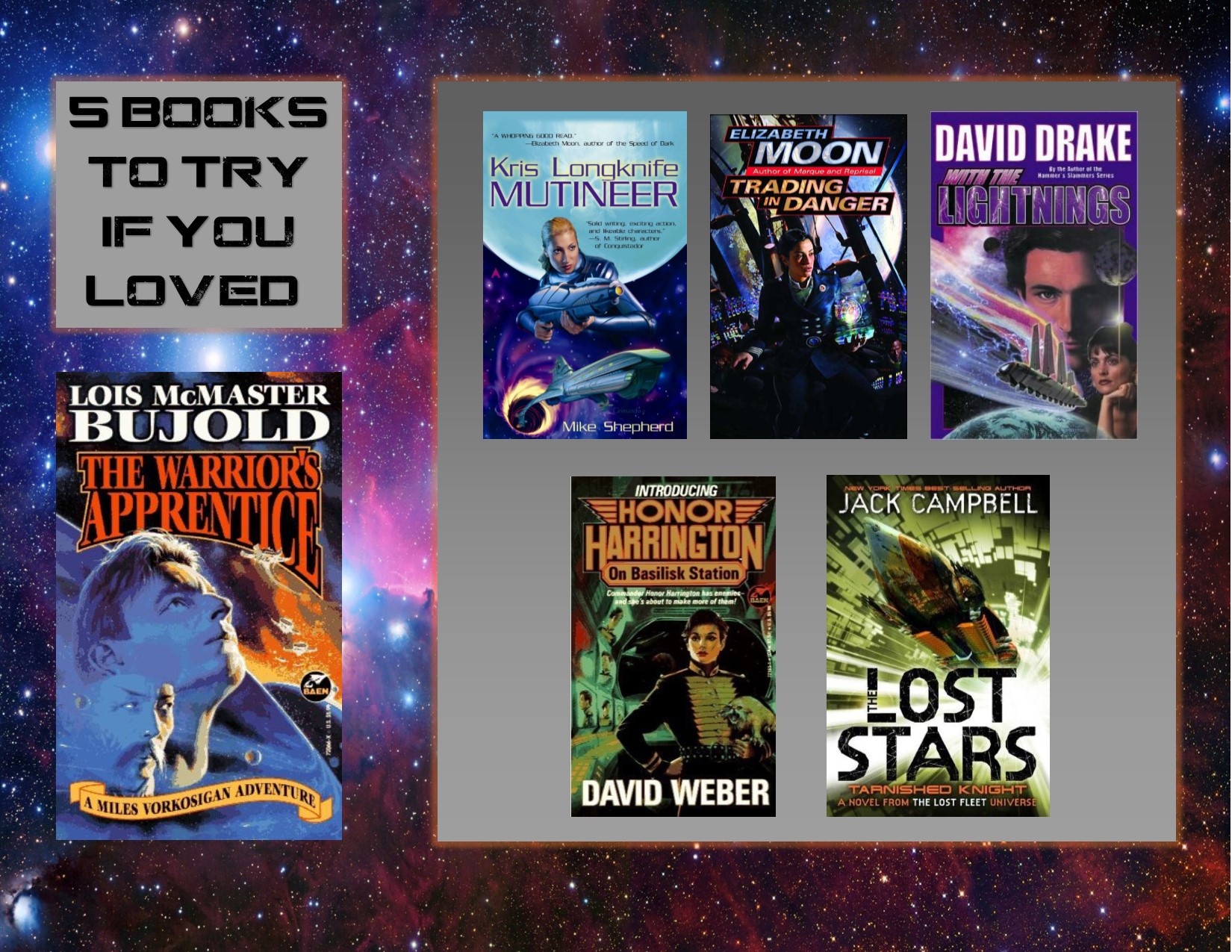 Mutineer (Book 1 in the in the Kris Longknife series) by Mike Shepherd: Just like Miles, Kris Longknife is born into privilege and wealth. She’s well-bred, beautiful, and would make a great wife to any man. Too bad she doesn’t want to get married. Against her parents’ wishes, Kris enlists in the marines. Hardcore military sci-fi fans may not enjoy this book’s lighter angle, but Shepherd’s book would appeal to space opera aficionados.